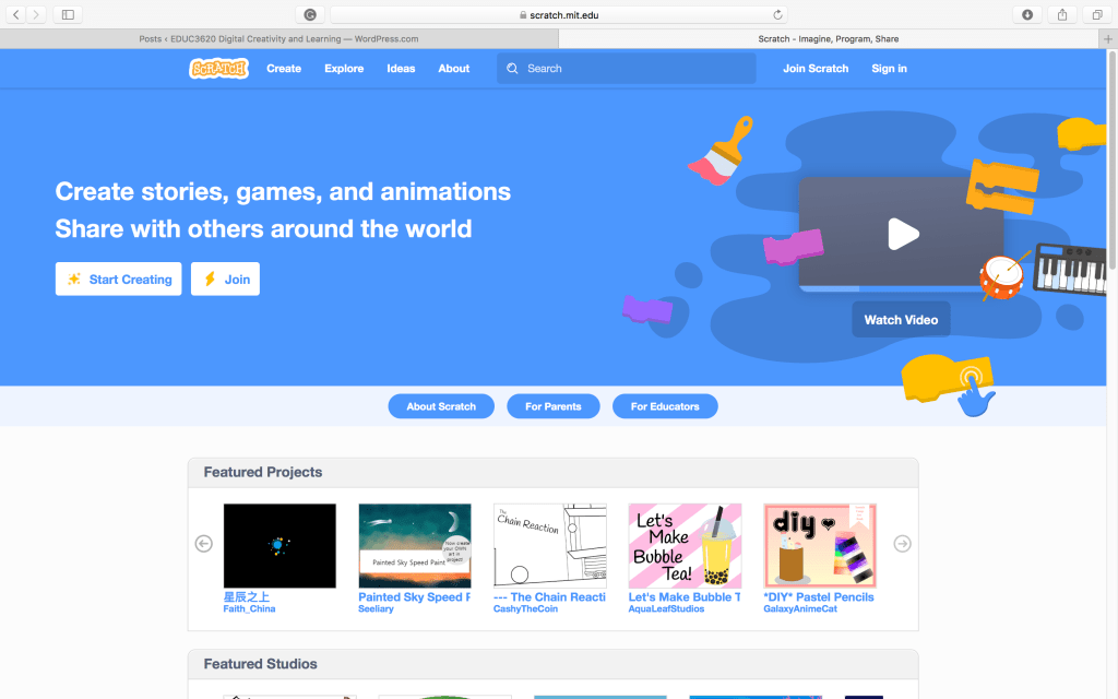 What is it? Scratch is a visual programming tool which uses block based language and coding to develop interactive animations and games, it is specifically targeted at primary students. Scratch encourages creativity through the few limitations it has and the vast range of possibilities it encompasses for design. Also, through the use of coding, students are frequently encouraged to develop their problem solving skills (Squire, 2006).